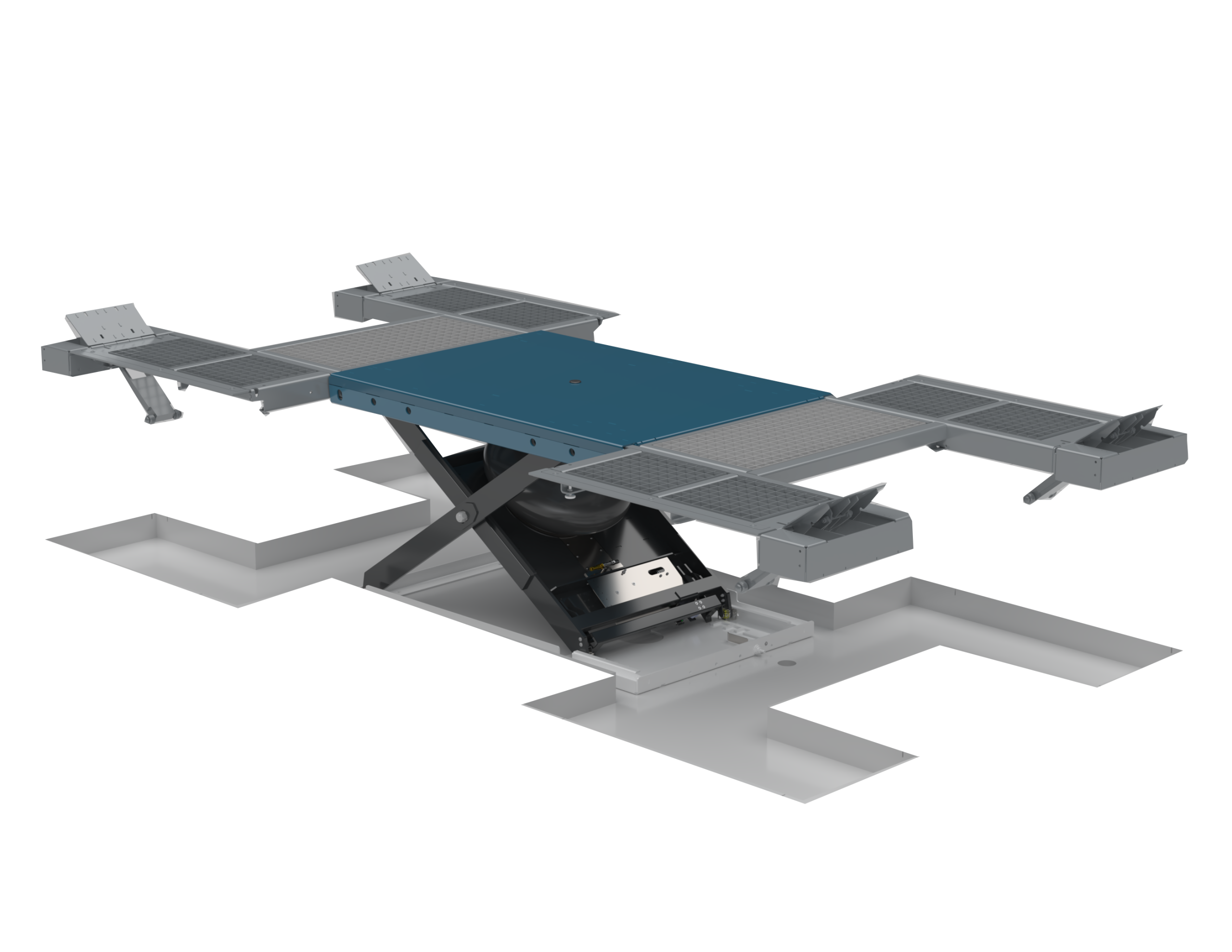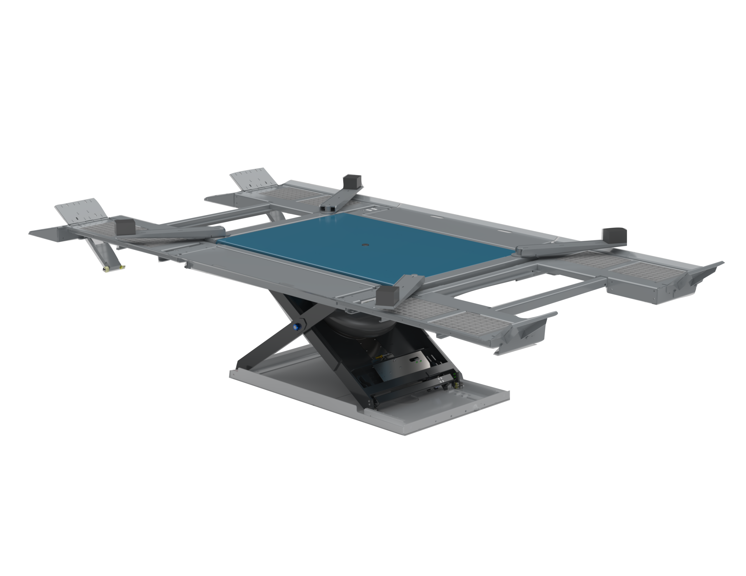 Pneumatic in-ground Herkules lift for body or paint shops, lifting 2.8 t on wheels